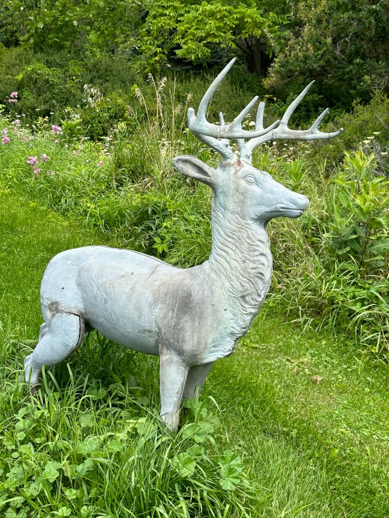 ITEM #1036 Zinc and Concrete Stag 48” tall. 36” long on zinc and concrete base. One damaged back leg.