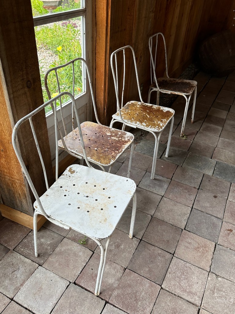 ITEM #1044 Paris Park Chairs, Bent steel rods and pan seats. 32” back and 16” seat.