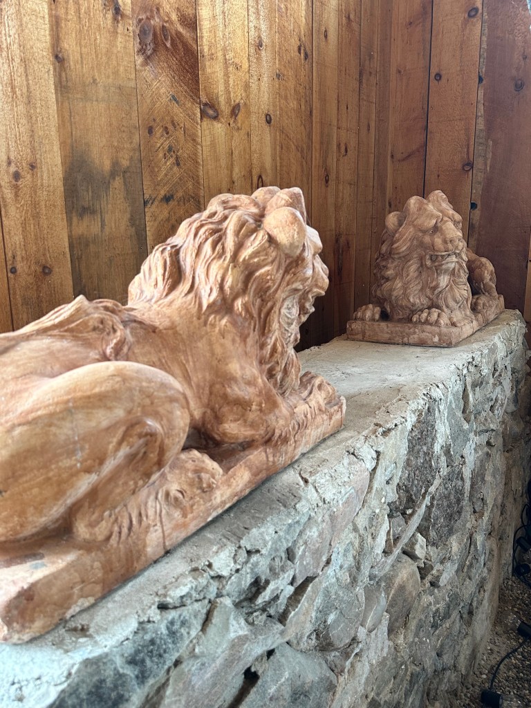 ITEM #1046 Italian Terra Cotta Lions. 36” long 20” tall 18” wide. Excellent condition