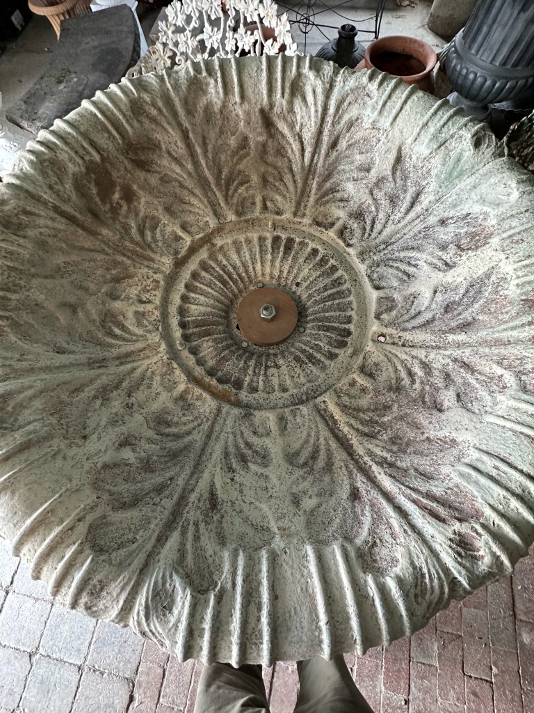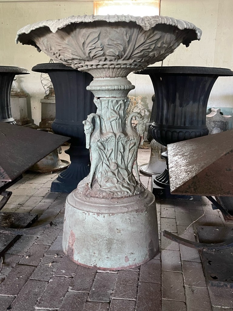 ITEM #1033 Pair of Fiske Fountain Bowls on elaborate Crane Pedestals. Bowl 36” dia. 12” deep Total height 40″