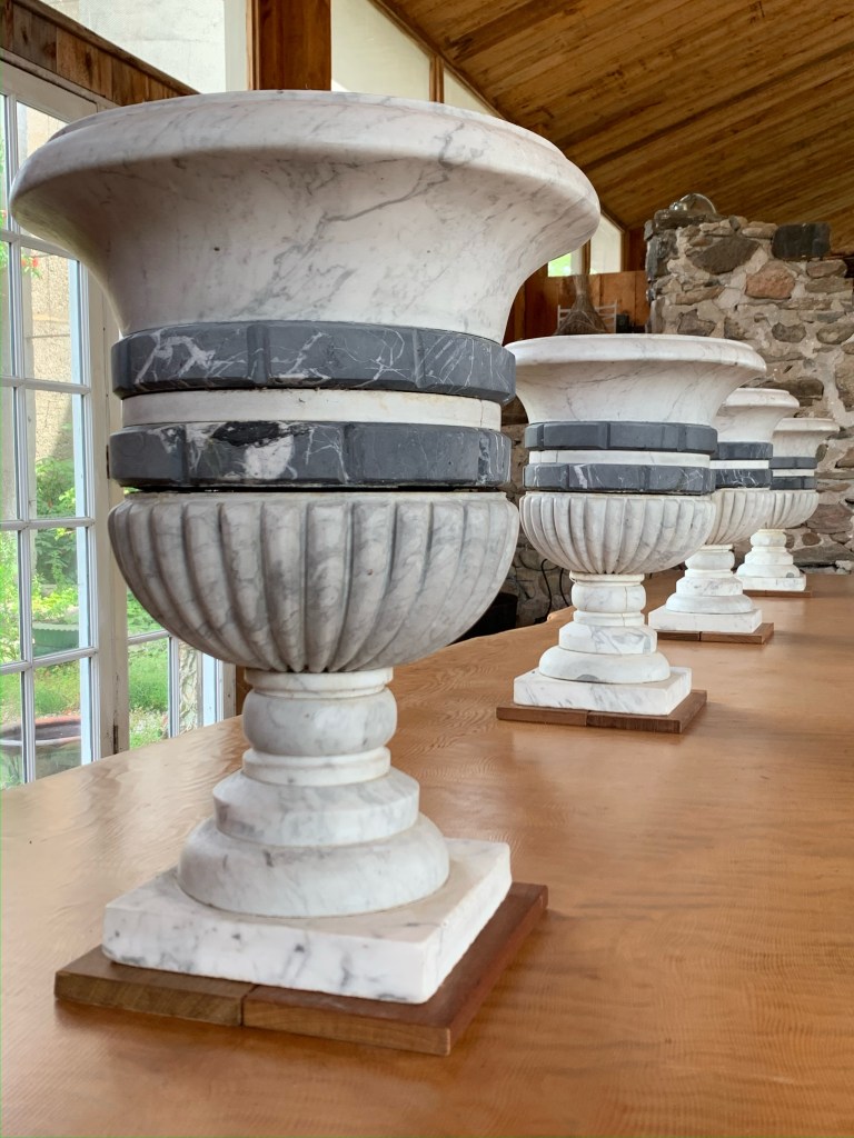 ITEM #1045 Four fabulous marble urns. 22” tall, 17” dia Base 9” square