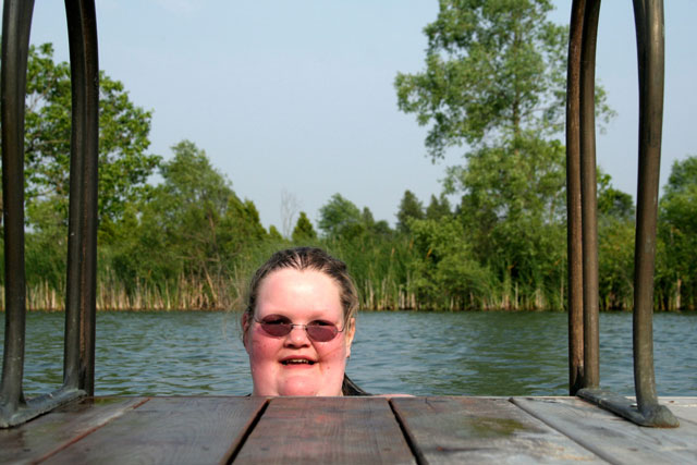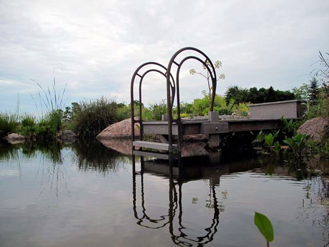 Antique sculpture of Greek Goddess Athena by a natural swimming pool.